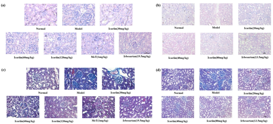 该研究构建T2DM模型,待大鼠成功表现出糖尿病肾病后,予以不同剂量的淫羊藿苷或厄贝沙坦灌胃。H&E染色的组织学切片显微照片显示,db/db小鼠和2型糖尿病大鼠存在严重的肾损伤,然而,使用淫羊藿苷和厄贝沙坦可以减轻此类损伤(图2a和b)。通过masson染色的组织学切片显微照片显示,db/db小鼠和2型糖尿病大鼠的肾纤维化状况得以改善,这得益于淫羊藿苷和厄贝沙坦的应用(图2c和d)。研究结果明确表明,淫羊藿苷对2型糖尿病动物的肾纤维化具有抑制作用。