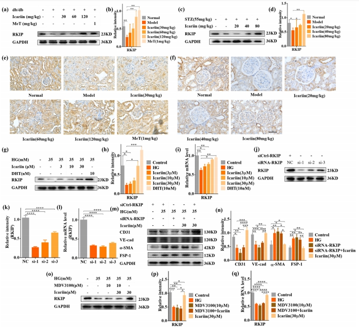在2型糖尿病动物的肾脏组织中,蛋白质印迹分析(图6a-d)及免疫荧光检测(图6e、f)结果显示,淫羊藿苷及MeT可增强RKIP的表达。同时,淫羊藿苷与DHT(AR激动剂)亦可上调HG诱导的mGEnCs中RKIP的蛋白及mRNA水平(图6g-i)。为进一步探讨RKIP在淫羊藿苷抑制肾脏EndMT过程中的作用,采用siRNA-RKIP沉默HG诱导的mGEnCs中的RKIP(图6j-l)。(图6m-n)经淫羊藿苷及siRNA-RKIP处理的HG诱导的mGEnCs,与内皮特征相关的蛋白(CD31及VE-cad)表达显著降低,而与间充质特征相关的蛋白(FN、α-SMA、FSP-1)表达显著增加。此外,淫羊藿苷对RKIP的激活可被AR拮抗剂(MDV3100)抑制(图6o-q)。综上,淫羊藿苷通过激活AR/RKIP途径对糖尿病肾病具有抑制作用。