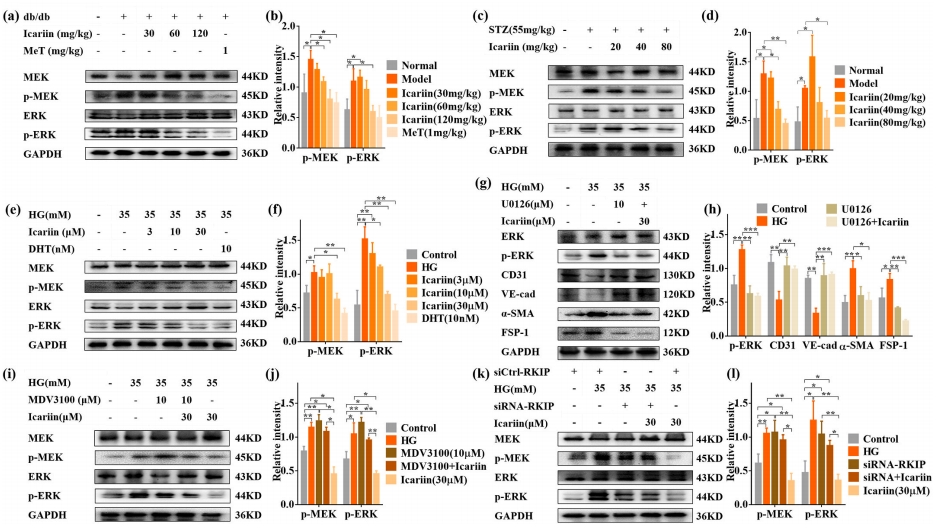 在db/db小鼠和2型糖尿病大鼠的肾组织中,淫羊藿苷及MeT抑制了p-MEK和p-ERK的表达增加(图7a-d)。同时,淫羊藿苷与雄激素受体(AR)对MEK/ERK通路的抑制作用亦在高糖诱导的mGEnCs中体现(图7e-f)。MEK抑制剂U0126显著抑制了HG诱导的mGEnCs中的内皮间质转化(EndMT,图7g-h)。为证实AR及RKIP在淫羊藿苷抑制MEK/ERK途径中的作用,实验采用了MDV3100及siRNA-RKIP,MDV3100和siRNA-RKIP显著阻断了淫羊藿苷在MEK/ERK通路中的调节作用。综上,淫羊藿苷通过调节AR/RKIP以抑制MEK/ERK,从而减轻肾脏内皮间质转化。