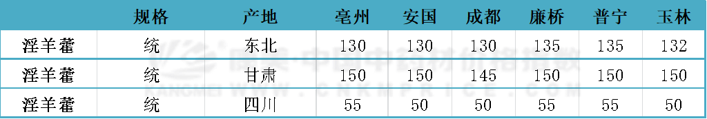 玉林:产区近期来货量一般,市场货源以正常消化为主,关注度一般,行情稳定运行,甘肃淫羊藿含量货160-165元之间,贵州箭叶统货45-50元不等。