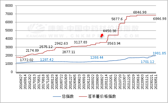 从历史(2013年4月16日至2023年5月11日)价格指数走势看,指数最高值出现在2022年5月30日,当时指数值为6846.98点,最低值为2013年6月20日的1137.76点,两者相差5709.22点,淫羊藿的价格波动很大, 9年上涨4倍多。