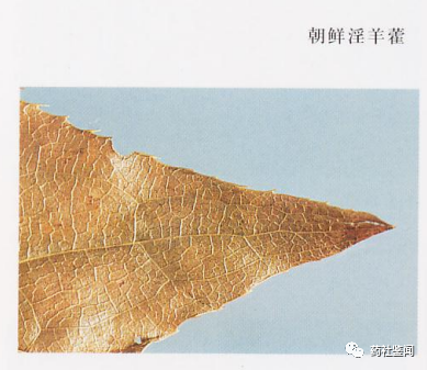箭叶淫羊藿 一回三出复叶,小叶片长卵形至卵状披针形,长4~12cm,宽2.5~5cm;先端渐尖,两侧小叶基部明显偏斜,外侧多呈箭形。下表面疏被粗短伏毛或近无毛。叶片革质。朝鲜淫羊藿图