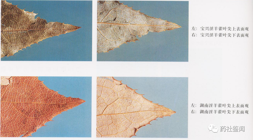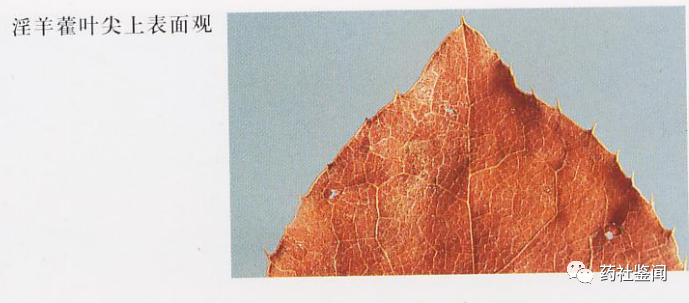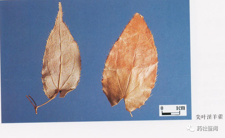 为小檗 科 植物 尖叶淫 羊藿Epimedium acuminatum Franch. 本品性状与箭叶淫羊藿相似,主要不同点为∶叶片革质,叶基部呈宽凹状,叶缘锯齿较稀疏,齿距大而硬,叶背面有众多粗短状伏毛,在放大镜下呈纺锤状。