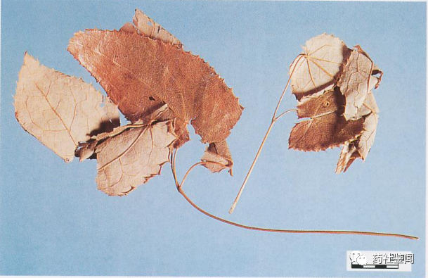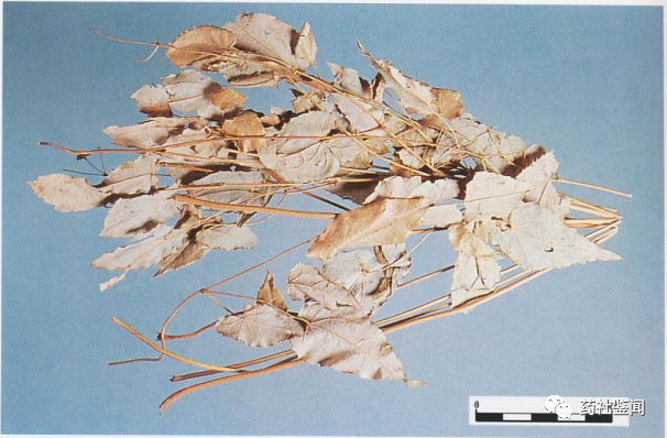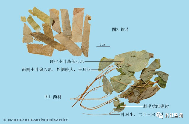 本品茎细圆柱形。长约 20cm。表面黄绿色或淡黄色,具光泽。茎生叶对生,二回三出复叶,小叶片卵圆形,长3cm~8cm,宽 2cm~6cm,先端微尖;顶生小叶基部心形;两侧小叶较小,偏心形;外侧叶较大,呈耳状;叶边缘具黄色刺毛状细锯齿、上表面黄绿色,下表面灰绿色,主脉 7条~9条,基部有稀疏细长毛,细脉两面突起、网脉明显;小叶柄长 lcm~5cm。叶片近革质。气微,味微苦。