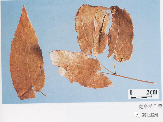 药材为小檗科植物箭叶淫羊藿Epimedium sagittatum (Sieb.et Zucc.)Maxim.的干燥地上部分。本品为一回三出复叶,小叶片长卵形至卵状披针形,长 4cm~12cm,宽2.5cm~5cm;先端渐尖,两侧小叶基部明显偏斜,外侧呈箭形。下表面疏被粗短伏毛或近无毛。叶片革质。