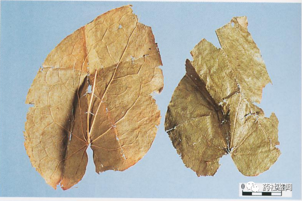 本品叶片较大,有的可达 20cm,宽可至 10cm,纸质。叶背常呈灰白色,毛苜较少。叶基部凹陷处常平截。