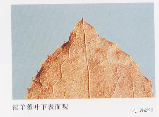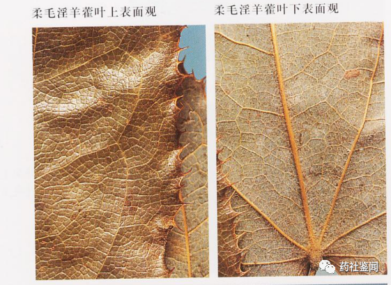 本品性状与箭叶淫羊藿类似,主要不同点为∶ 叶基部两侧裂片常稍圆,叶背面灰白色,有众多棕色粗硬长毛茸。