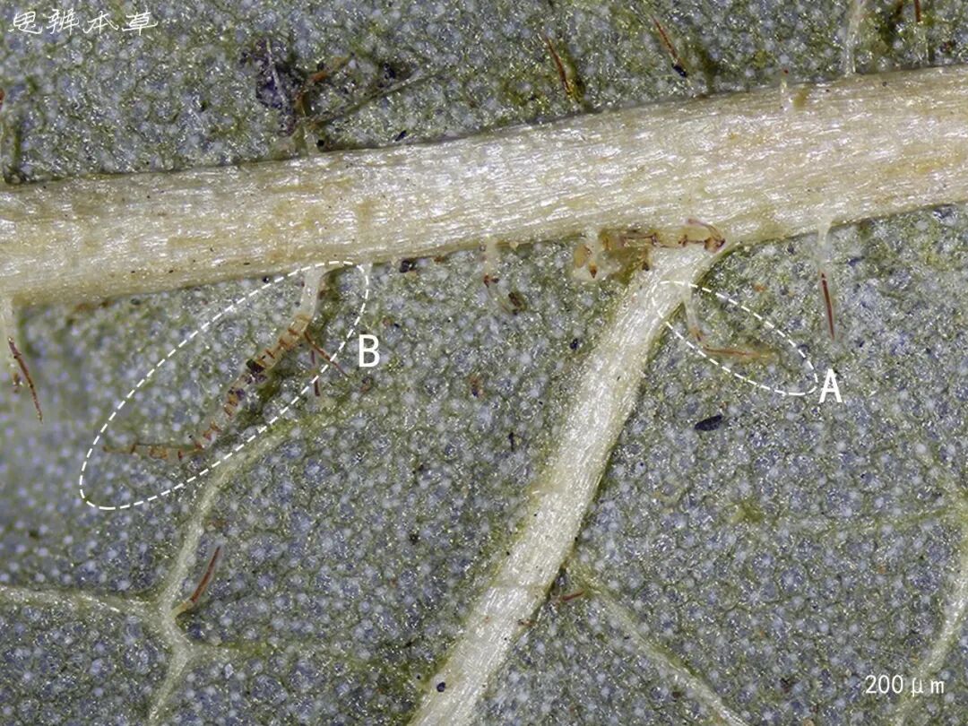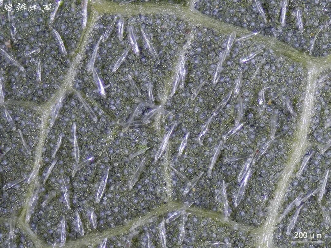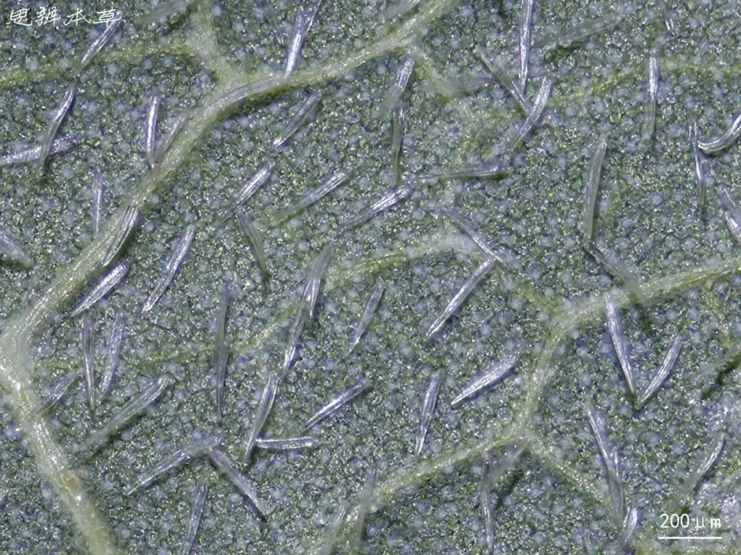叶下表面具乳突,非腺毛有两种,A种较短,数量多;顶端细胞与邻近细胞近长或较长,先端锐尖;另B种较长、粗,分部在叶脉上,细胞多至20余个,长超过1000μm,顶端细胞钝圆,念珠状,相接处缢缩且含有棕黄色油状物。