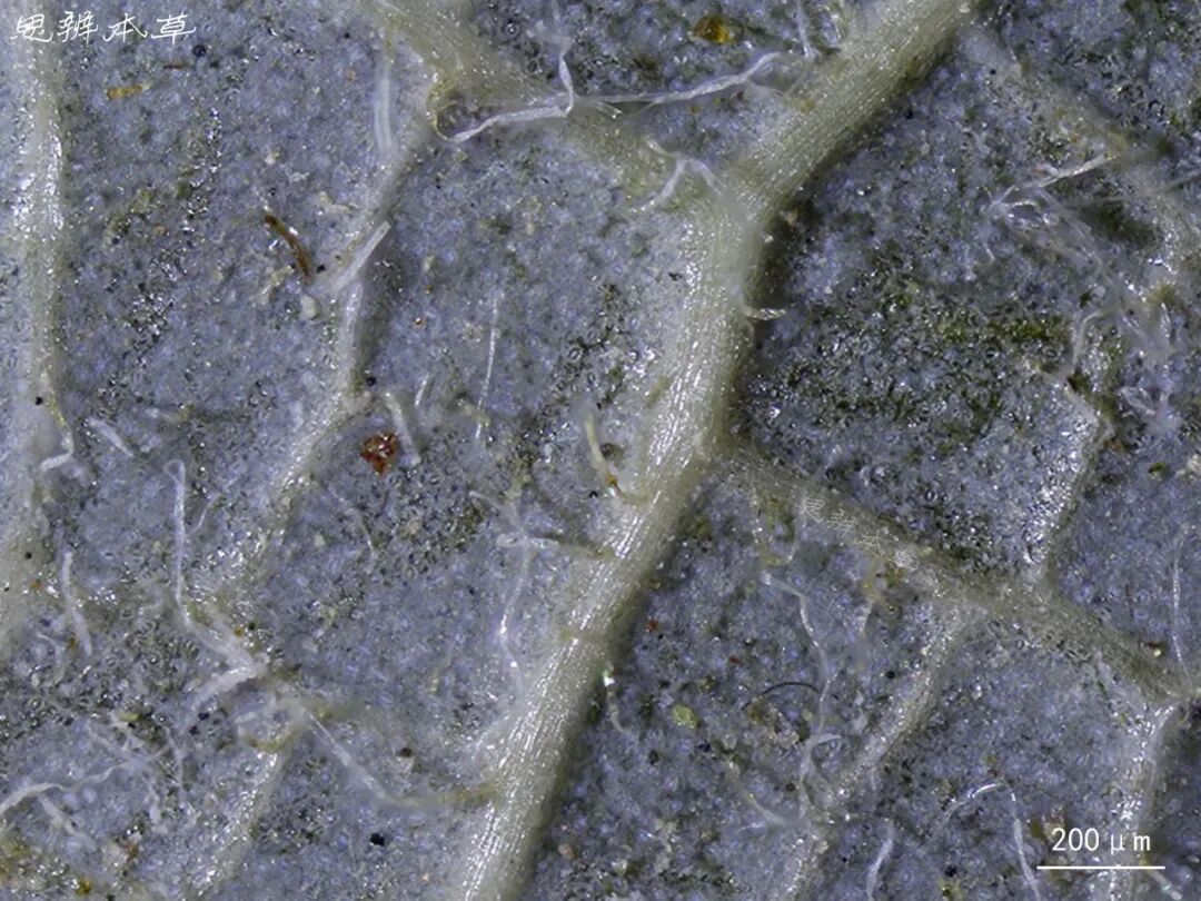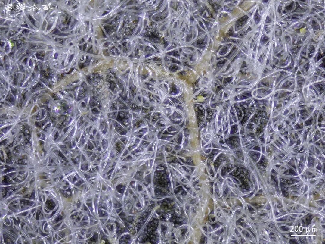 柔毛白色细长,主要分布于叶脉上。顶端细胞柔软扭曲,极长,先端稍圆,短细胞多为4~6个,呈短结节状,基部细胞内含有棕黄色物质。