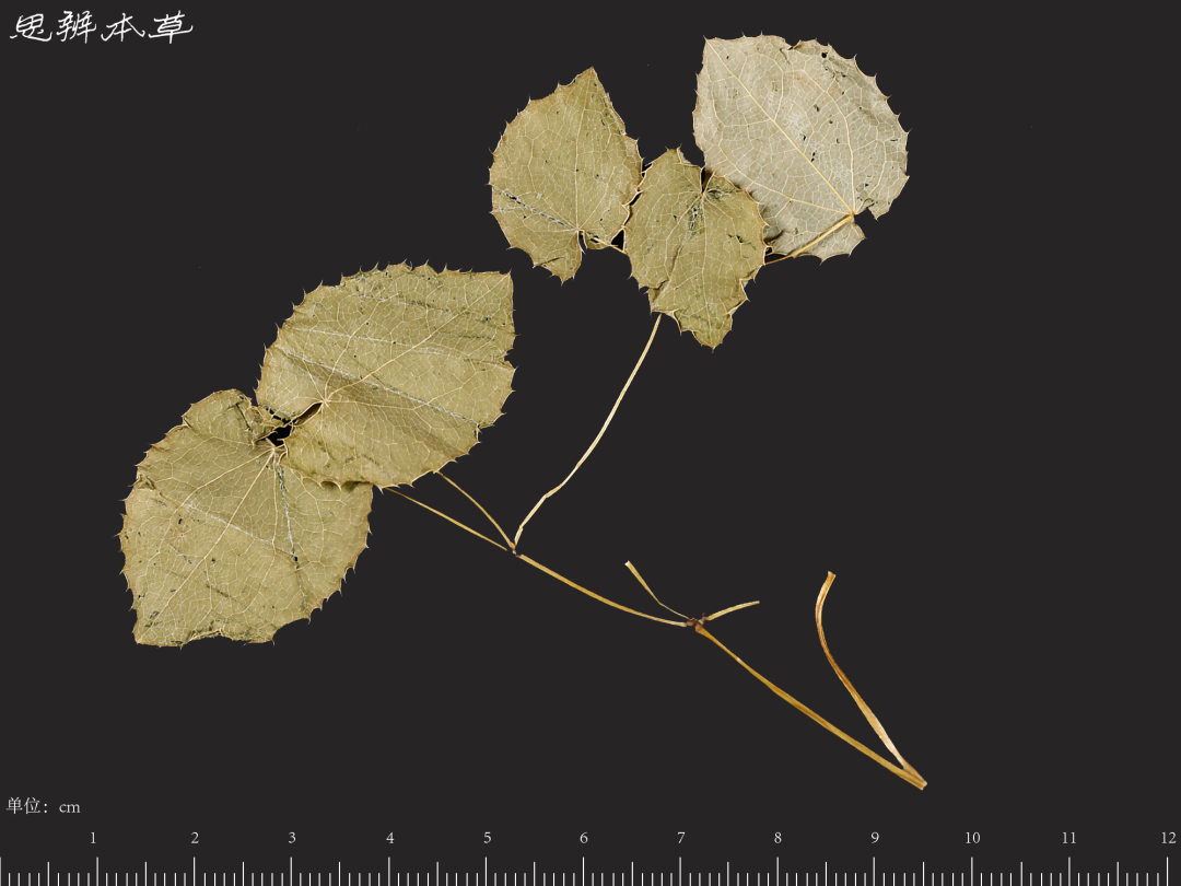 顶生小叶基部心形,两侧小叶偏心形。叶边缘具黄色刺毛状细锯齿。