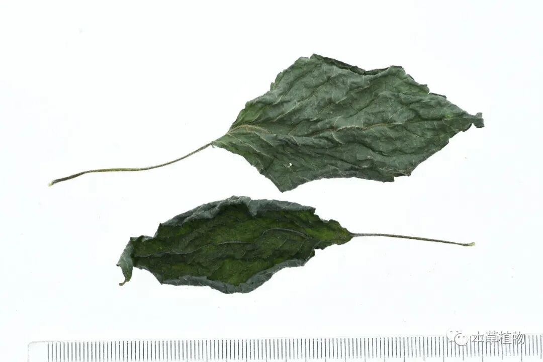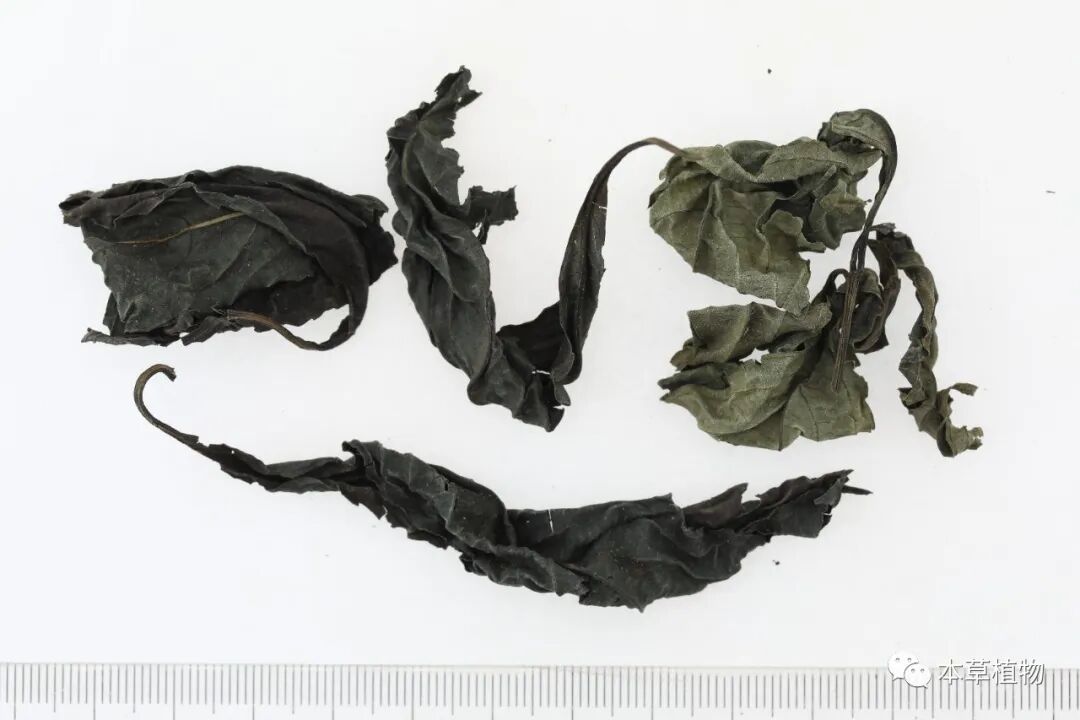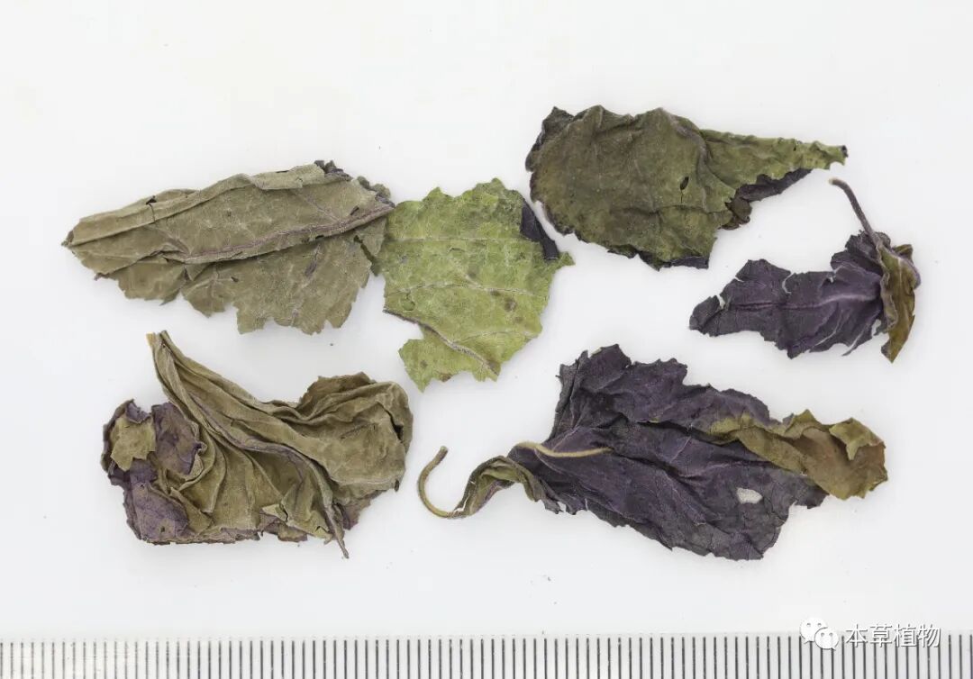 2、紫苏叶:本品为唇形科植物紫苏Perilla frutescens(L.)Britt.的干燥叶(或带嫩枝)。夏季枝叶茂盛时采收,除去杂质,晒干。