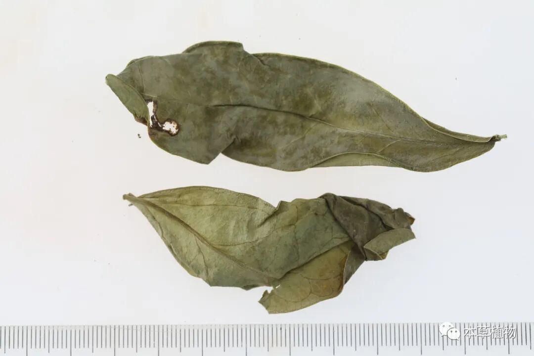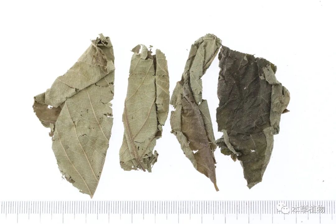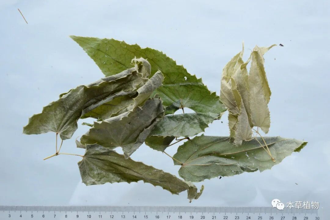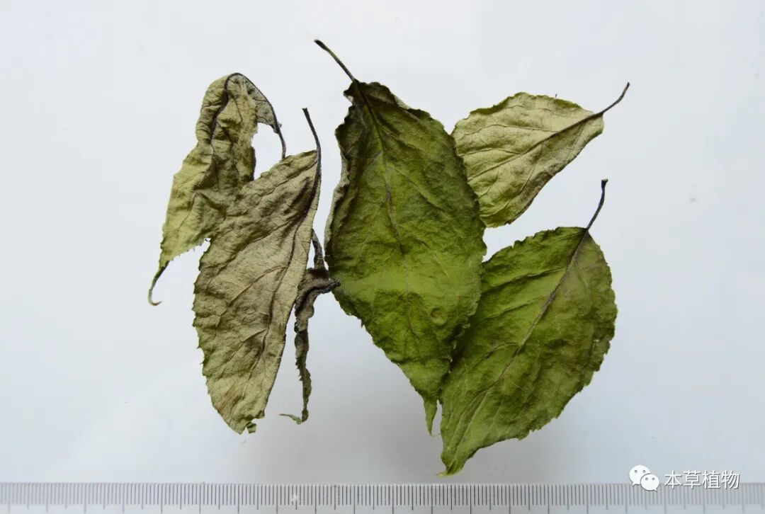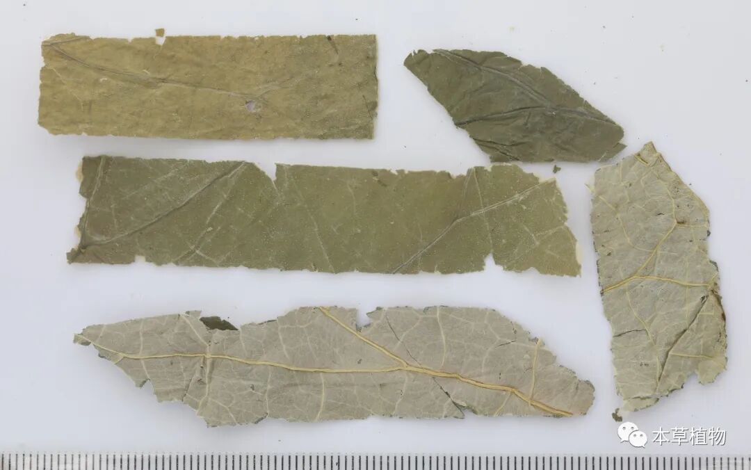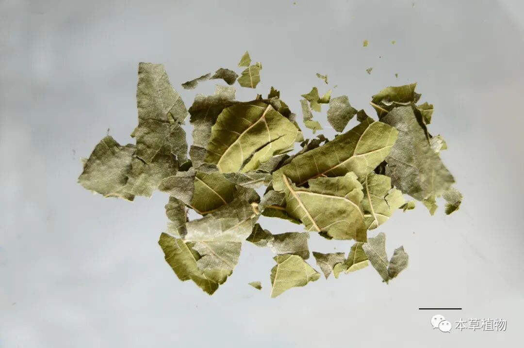 19、白麻:本品来源于夹竹桃科植物白麻Apocynum pictumSchrenk的干燥叶。夏季采收,除去杂质,干燥。