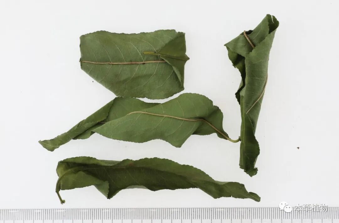 45、桃叶:本品为蔷薇科植物桃Amygdalus persicaL.的干燥叶。夏、秋二季枝叶茂盛时采 收,除去杂质,晒干。
