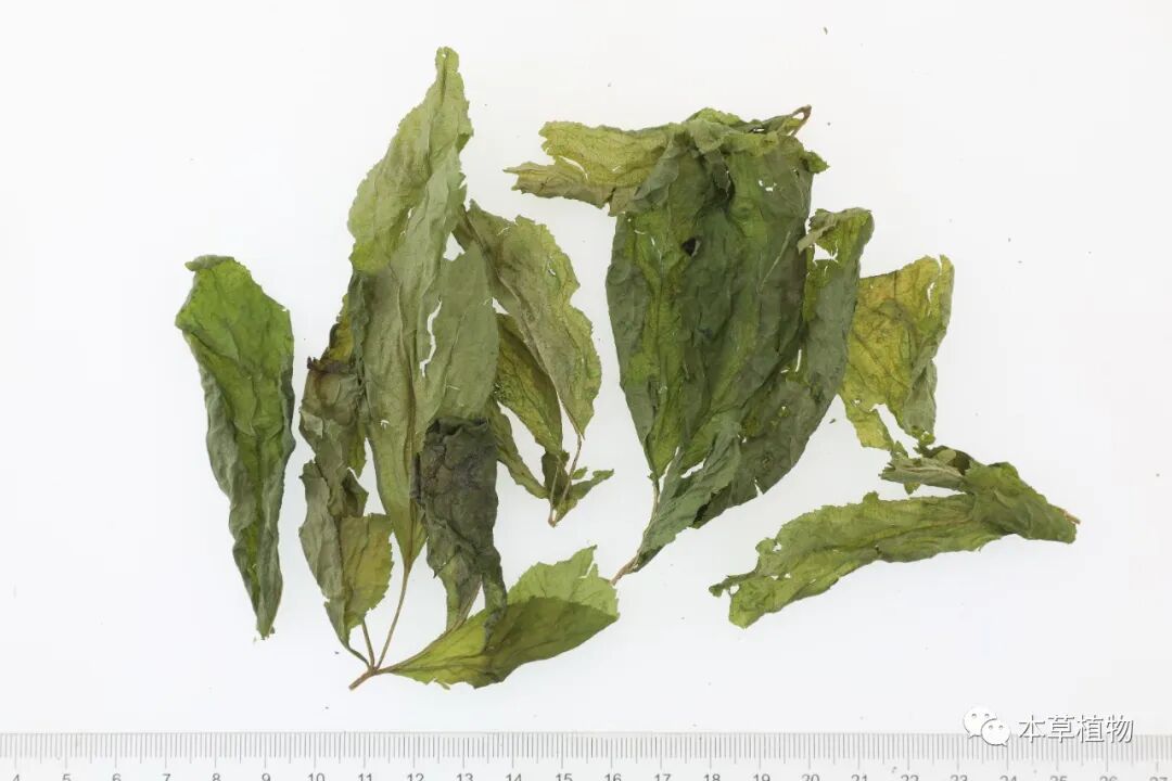 43、白苏叶:本品为唇形科植物白苏Perilla frutescens(L.) Britt.的干燥叶或带叶嫩枝。春 、秋二季采收叶,除去 杂质,置通风处阴干;或摘取带叶嫩枝,切段,置通风处阴干。