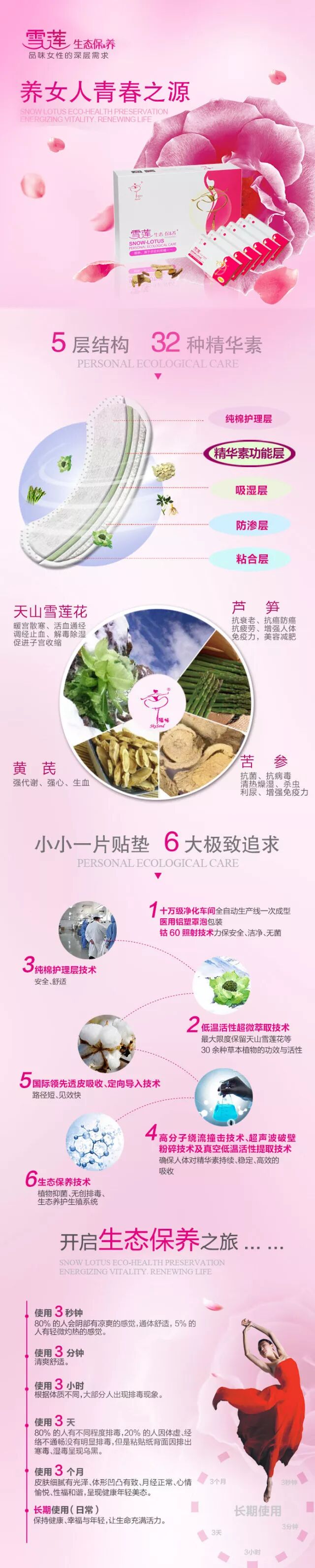 是以无创排毒为核心专利技术,且将植物抑菌、生态养卵等多项高科技融为一体的女性的生态保养品,以纯棉针织布为载体,以天山雪莲花等32味草本植物精华素组方,通过会阴部粘膜、毛细血管、会阴穴定向导入透皮吸收,直达生殖系统,深层养护、洁净内在、呈现健康美态,从源头上让女性长期保持健康、幸福和年轻。