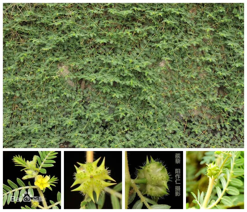 【植物形态】一年生匍匐草本,多分枝,全株有柔毛。羽状复叶互生或对生,小叶5~7对,长椭圆形,长6~15毫米,宽2~5毫米,基部常偏斜,有托叶。花单生于叶腋;萼片5;花瓣5,黄色,早落;雄蕊10,5长5短;子房上位,5室,柱头5裂。果实由4~5个分果瓣组成,每果瓣有长短棘刺各1对。种子卵状三角形。花期5~7月,果期7~9月。