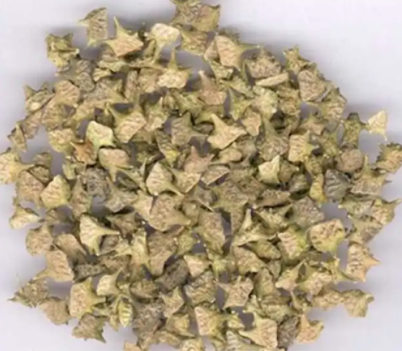 【药材性状】复果多由5个分果瓣组成,放射状排列呈五棱状球形,直径0.7~1.2厘米。商品常裂为单一的分果瓣,斧状三角形,长3~8毫米,淡黄绿色,背部隆起,有纵棱及多数小刺,并有对称的长刺和短刺各1对,成八字形分开,两侧面粗糙,有网纹,灰白色;果皮坚硬,木质,内含种子3~4粒。种子卵圆形,稍扁,淡黄绿色,有油性。气微,味苦。