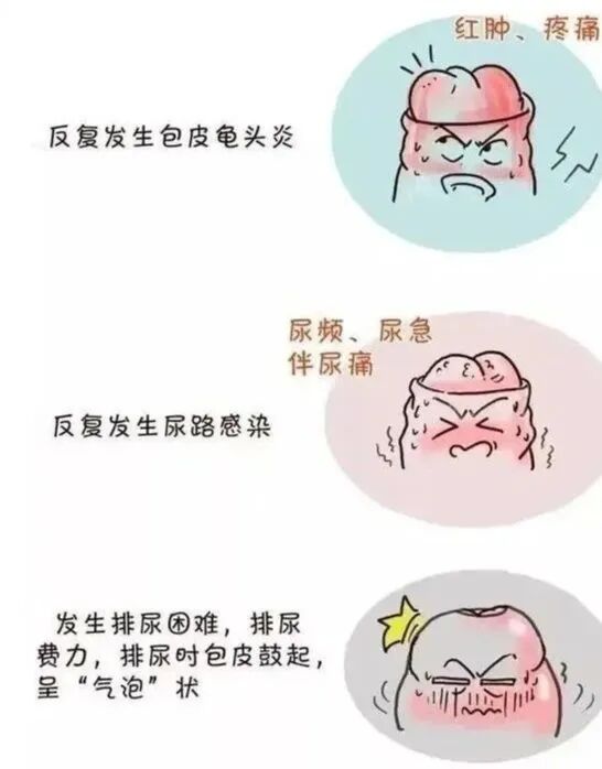 1、包皮不能翻起,阴茎头不能露出;阴茎反复发炎,肿大,影响解小便;