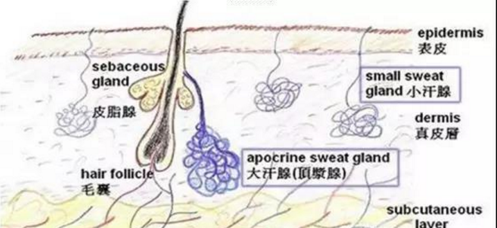狐臭在医学上称为腋臭,以天热汗多时明显。人体汗腺分大汗腺and小汗腺,小汗腺排泄大部分的汗液,其99%为水分,是多汗的罪魁祸首。而腋臭的来源当属大汗腺(顶浆腺),其位置较小汗腺深(位于真皮深层和脂肪浅层),分泌物中含有蛋白质、脂质等成分,刚分泌时并无任何气味,但被皮肤表面细菌(主要为是表皮葡萄球菌,革兰氏阴性杆菌)分解,产生不饱和脂肪酸,从而有了异常气味。大汗腺受内分泌的影响,故多在青春期出现,到老年即可减轻或消失。