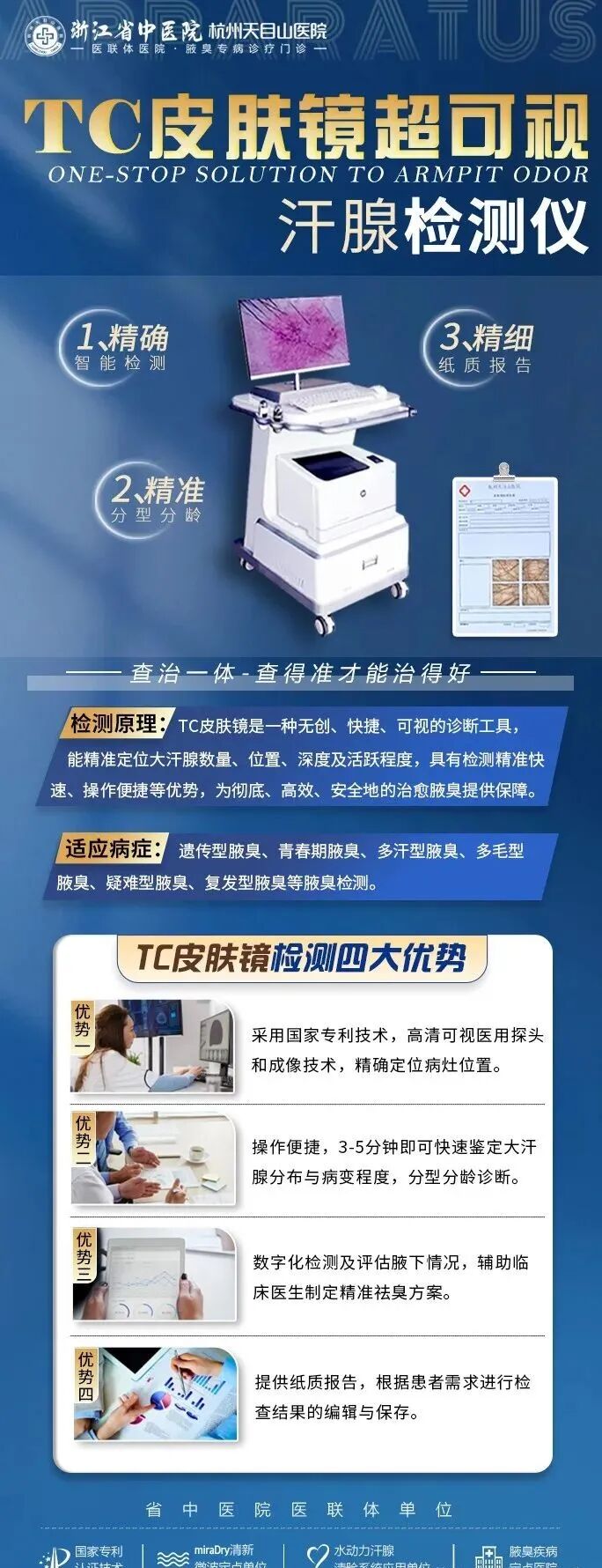 杭州天目山医院腋臭科由十多年腋臭临床诊疗经验的专职医师坐诊,签约治疗。并定期邀请知名专家来院会诊、授课、技术指导。此外,科室推崇的6+1全病程立体诊疗体系。实现了腋臭诊疗由单一技术向诊、查、除、修、护、愈、诺的全方位升级,为众多腋臭患者成功摆脱腋臭困扰,祛臭效果业界领先。