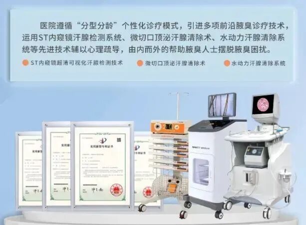 济南附一医院腋臭科遵循分型分龄个性化诊疗模式,引进多项前沿腋臭诊疗技术运用ST内窥镜汗腺检测系统、微切口顶泌汗腺清除术、水动力汗腺清除系统等先进技术辅以心理疏导,由内而外的帮助腋臭人士摆脱腋臭困扰!