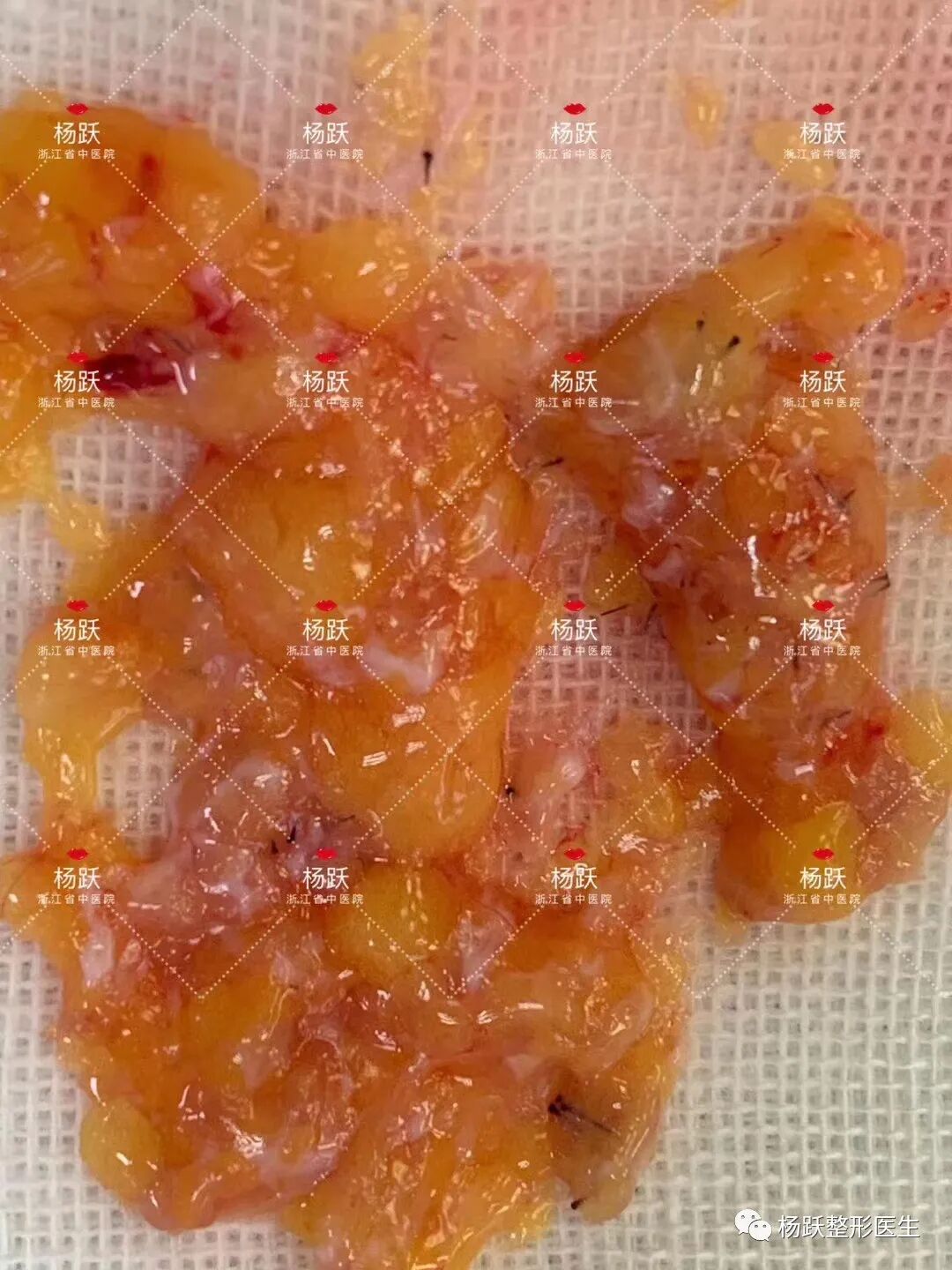 常规消毒、铺无菌手术巾后,麻醉,在腋下纹理处切口一长约2.5cm皮肤切口,沿切口剥离皮肤下组织,就可以看到引起腋臭的元凶(顶泌汗腺),顶泌汗腺是比脂肪组织更深的黄色(如下图),如果腋臭味道比较严重的人呈土黄色。