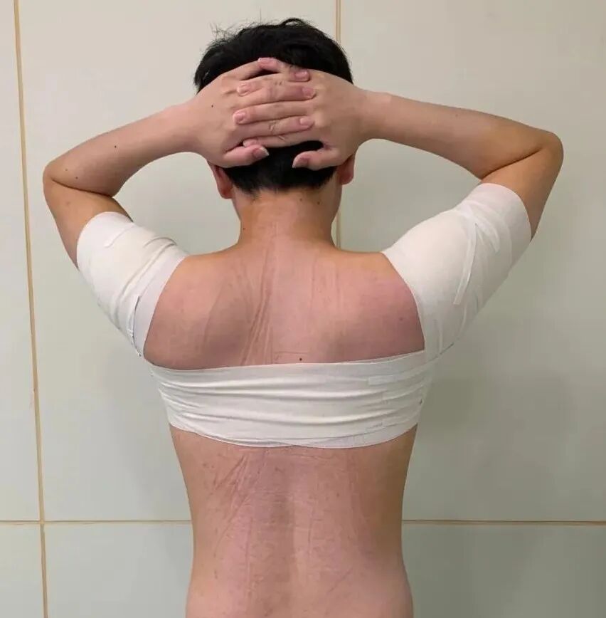 术后保持双上臂外展状态,使腋窝皮肤呈外展状态,双上臂保持制动,双手尽量不要动。术后1周内双手不可以放下,至少让手臂与躯干保持大于90°以上。
