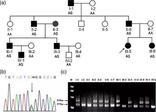 目前为止,国内关于ABCC11基因与腋臭发病的相关性的研究仅有2篇,其中一篇,对腋臭患者及正常人ABCC11基因多态性位点rs17822931等位基因型进行了检测。作者发现所有腋臭患者ABCC11的等位基因型均为GG或者AG,而正常人等位基因型均为AA。下图为在Chinese family中的研究结果: