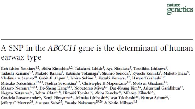 ABCC11,rs17822931决定腋臭与耳耵聍表型,是目前发现的唯一在人体有可见表现的单核苷酸位点。2005年,Yoshiura等首次发现这个SNP是湿性耵聍的决定性因素。而腋臭和耵聍变型紧密相关已有75年的历史了,早在1937年有研究报道过耳耵聍形态与腋臭的联系,即腋臭患者耳耵聍多伴湿性耳耵聍,而无腋臭的正常人耳耵聍多为干性。