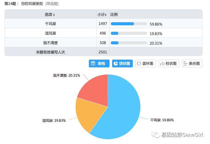 我们统计了2500例个体的self-report耳屎类型,其中19.8%是湿性耳屎。