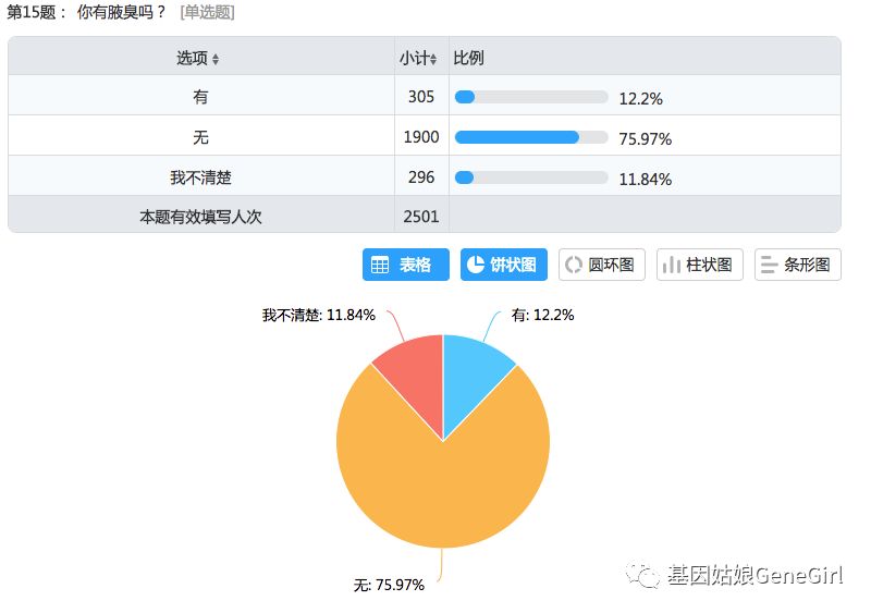 我们统计了2500例个体的self-report腋臭发生率,其中12%有腋臭发生。