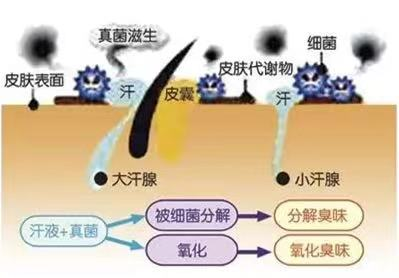 大汗腺液含有的各种蛋白质和脂肪酸被细菌分解后产生不饱和脂肪酸,导致了臭味的形成。