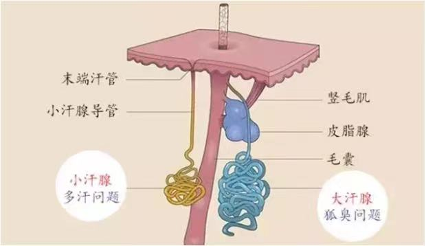 大汗腺:大汗腺的直径比小汗腺大10倍左右,主要分布在腋窝、乳晕、肛周和外生殖器部位,大汗腺分泌的是腋窝异味的主要来源。