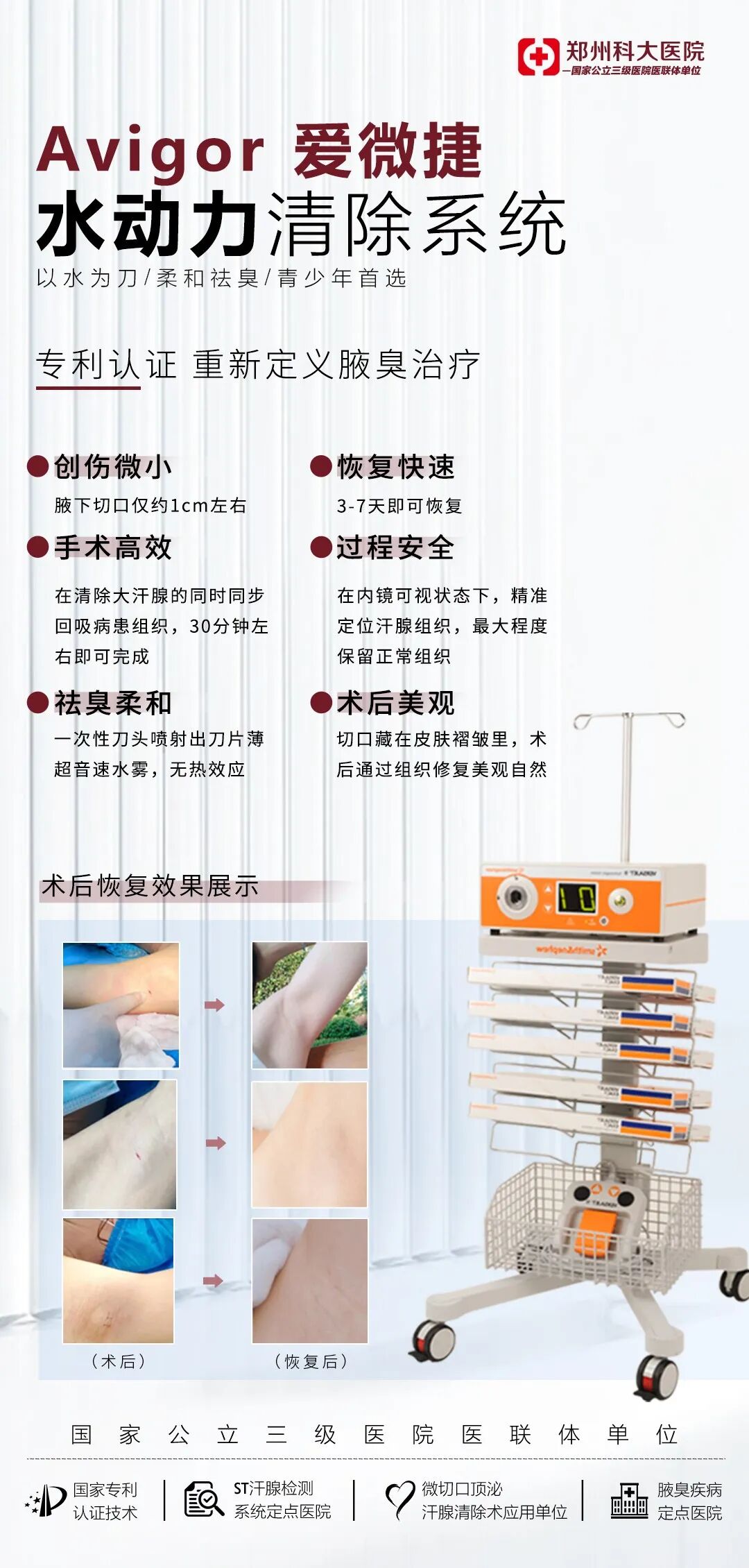 技术先进:专科引进多项前沿腋臭诊疗技术,如微切口腋下顶泌汗腺清除术,miraDry清新微波技术等,这些技术在业内具有较高的知名度和认可度。