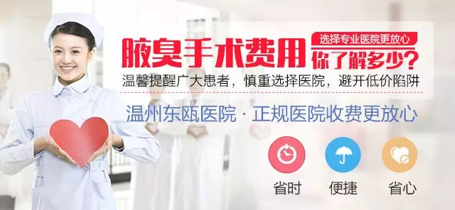 目前温州出现很多不正规的医疗机构,从而导致很多患者上当受骗,各种天价腋臭手术屡见不鲜,花费高达数千甚至上万元没治好复发的患者不在少数,所以在选择治疗腋臭前我们一定要详细了解清楚,切勿盲目问价而给一些不良机构钻了空子!狐臭手术费用包括:1:检查费 2:手术费 3:术后消炎换药费三部分组成。