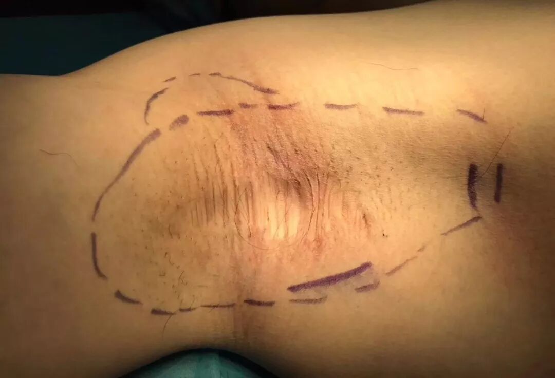 因此接着就是清除真皮层,不断变薄,直到达到黄金标准之后,立即转向下一个区域,直至所有区域的真皮层均符合标准。如何将只有2毫米厚度的真皮层切除,又不损伤正常皮肤功能,是摆在所有外科医生面前的一个挑战。