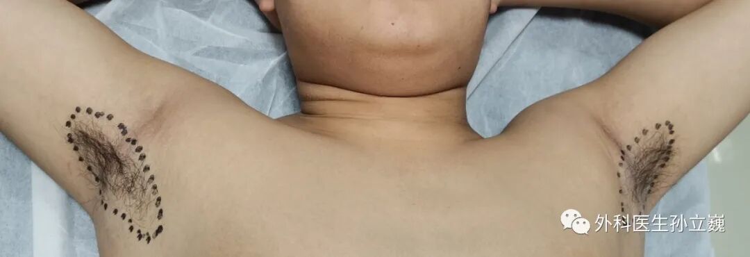 像这位患者的汗腺丰富,范围很大,按以往手术切除的方法,一次手术是切不了的。以往曾有Z形成形、S"形皮瓣真皮切除、1/2梭形皮瓣切除1/2皮瓣真皮刮除的处理方案。都因创伤及疤痕的问题困扰患者和手术医生。