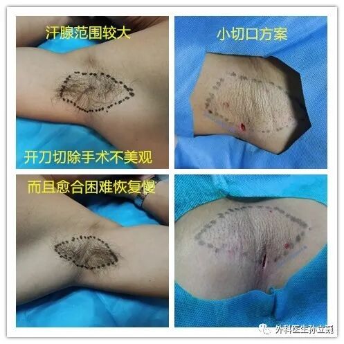 小切口的手术,因保留了皮肤,外观基本上不受影响。破坏汗腺基本上能达到手术切除的效果,但因其操作在皮下,属于盲操作。理论上来讲是有可能存在汗腺破坏不到位或不充分的地方,从而造成术后异味的残留。手术完成的质量,全凭术者的经验判断,要求较高。