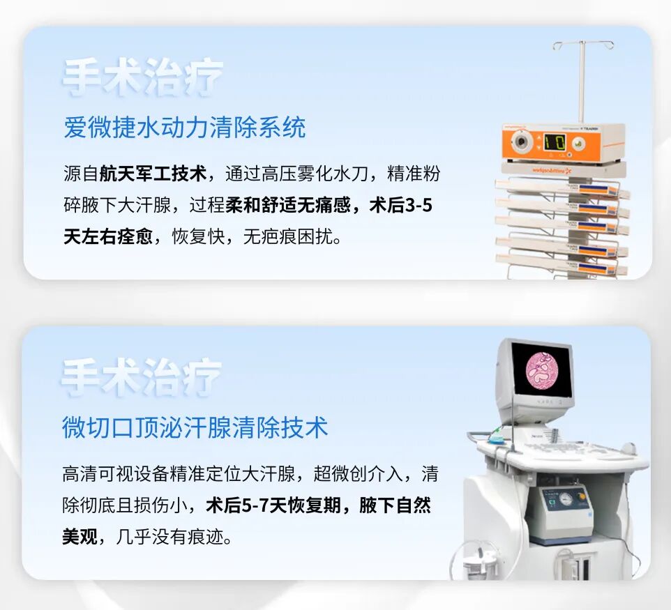如大汗腺切除术、腋下吸脂术、激光治疗和微波治疗等,这些手术方式各有优缺点,适用于不同情况的患者。例如,激光治疗创伤小、恢复快,但需要多次治疗才能达到满意效果;微波治创伤小、恢复快,复发率低。