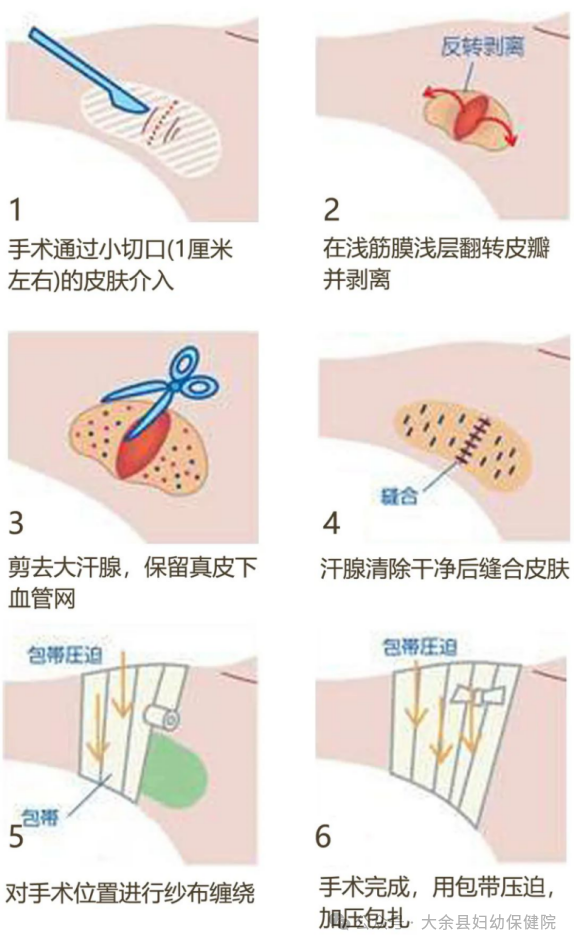 手术沿腋顶皮纹皱褶线切开皮肤1-1.5cm,分离皮下组织,在浅筋膜浅层翻转皮瓣,剪去大汗腺,保留真皮下血管网,边缘修剪到不含大汗腺的正常脂肪组织为止。