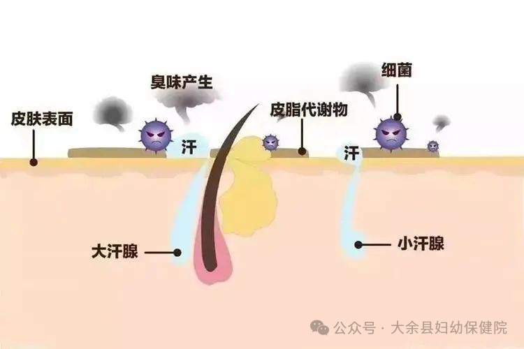 人体的汗腺有两种,一种是大汗腺,一种是小汗腺,大汗腺又称为顶泌汗腺,顶泌汗腺分布在人体的腋窝、会阴部、以及指缝的部位。顶泌汗腺分泌的汗液被皮肤表面的细菌分解释放的不饱和脂肪酸会产生一种特殊的臭味,这种臭味一般称为腋臭(也称狐臭、臭汗症)。