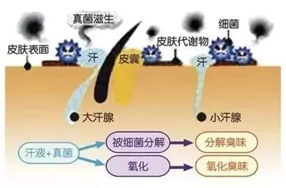 腋窝温度高,皱褶密闭、潮湿等都有利于局部菌群繁殖,异味增强。