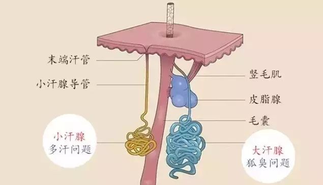 人体汗腺分为两种,一种就是分泌汗液的小汗腺,另一种就是引起腋臭也就是狐臭的大汗腺,又叫臭汗腺、顶浆腺。