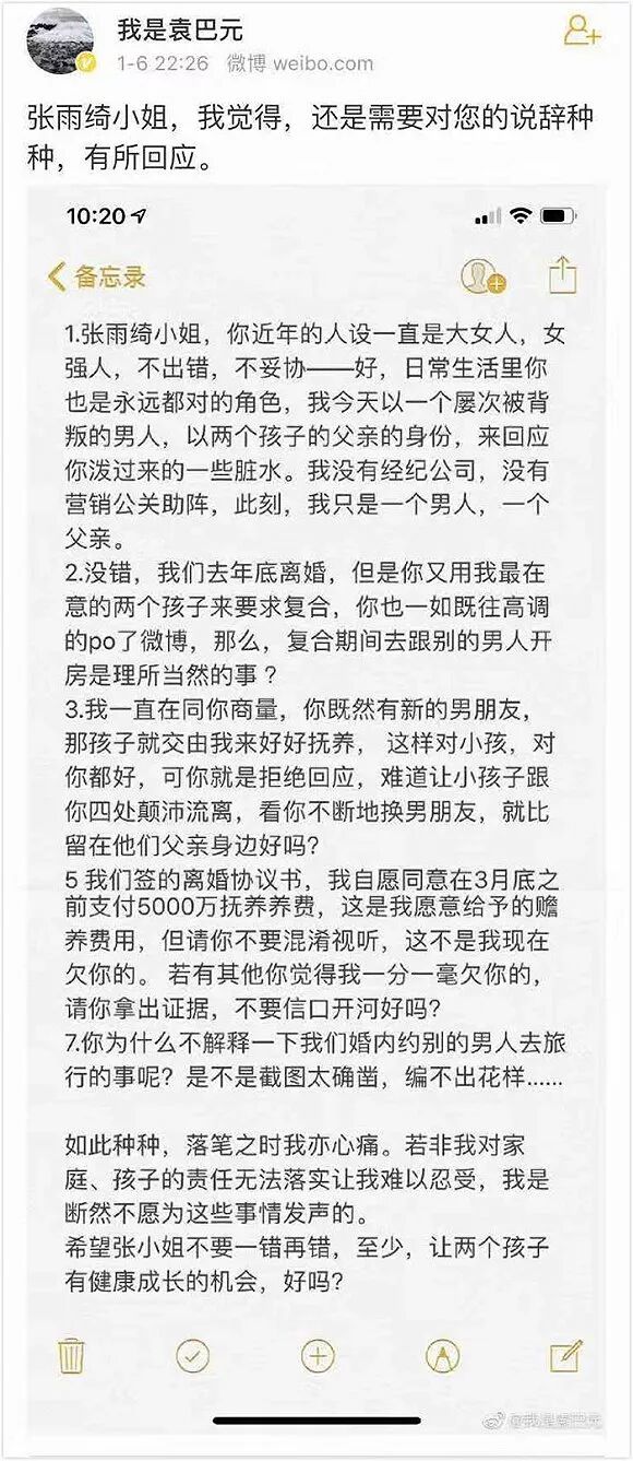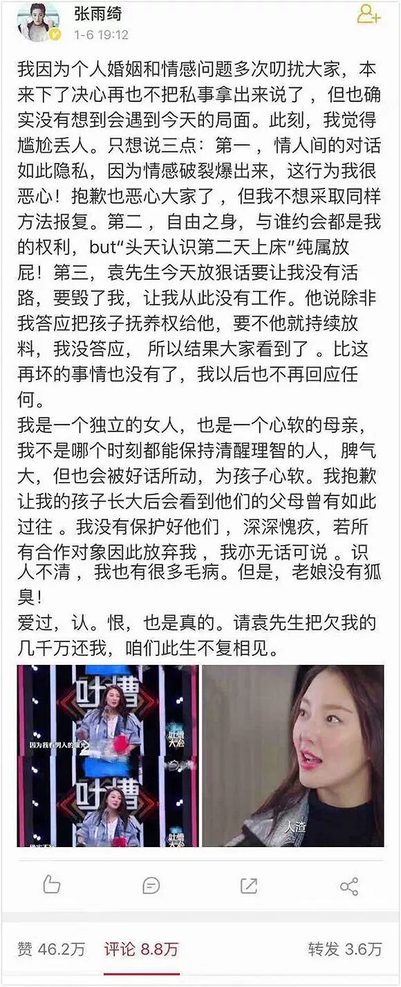 三小时后,袁巴元微博回应,不着46地列出了张雨绮的7宗罪。