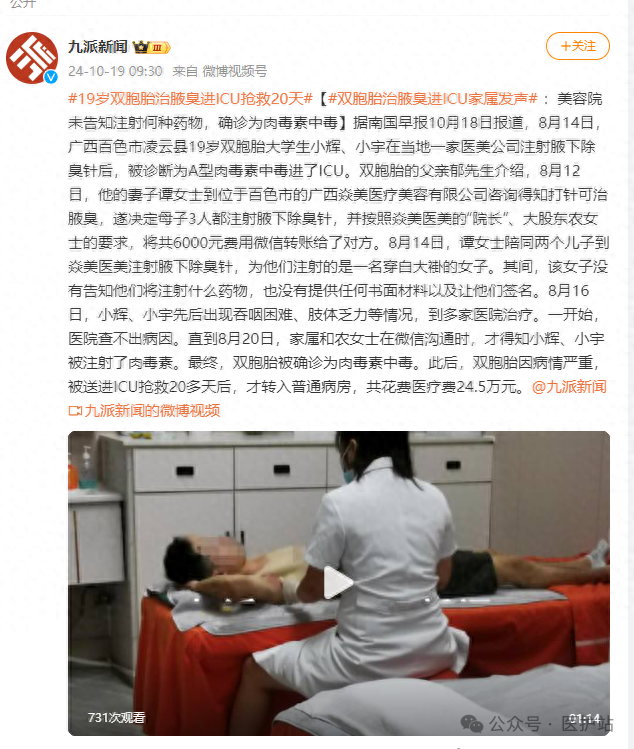据南国早报10月18日报道,8月14日,广西百色市凌云县19岁双胞胎大学生小辉、小宇在当地一家医美公司注射腋下除臭针后,被诊断为A型肉毒素中毒进了ICU。双胞胎的父亲郁先生介绍,8月12日,他的妻子谭女士到位于百色市的广西焱美医疗美容有限公司咨询得知打针可治腋臭,遂决定母子3人都注射腋下除臭针,并按照焱美医美的院长、大股东农女士的要求,将共6000元费用微信转账给了对方。
