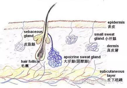 一般而言,人体皮肤汗腺有两种,一种是小汗腺散布于全身,分泌99%的水分和盐分,另一种为顶浆腺又名大汗腺位于肌肤真皮层,开口于毛囊根部,主要分布在腋下,阴部,足底等部位,而产生狐臭的主要原因就是由于患者腋下的大汗腺过度发达,异常分泌出大量浓稠含有油脂、蛋白质及铁分的物质,经由腋下的细菌分解后产生恶臭。