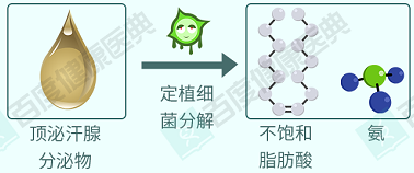 顶泌汗腺分泌物本身无异味,而腋窝皮肤表面的定植细菌可分泌物产生不饱和脂肪酸和氨,从而出现异味。