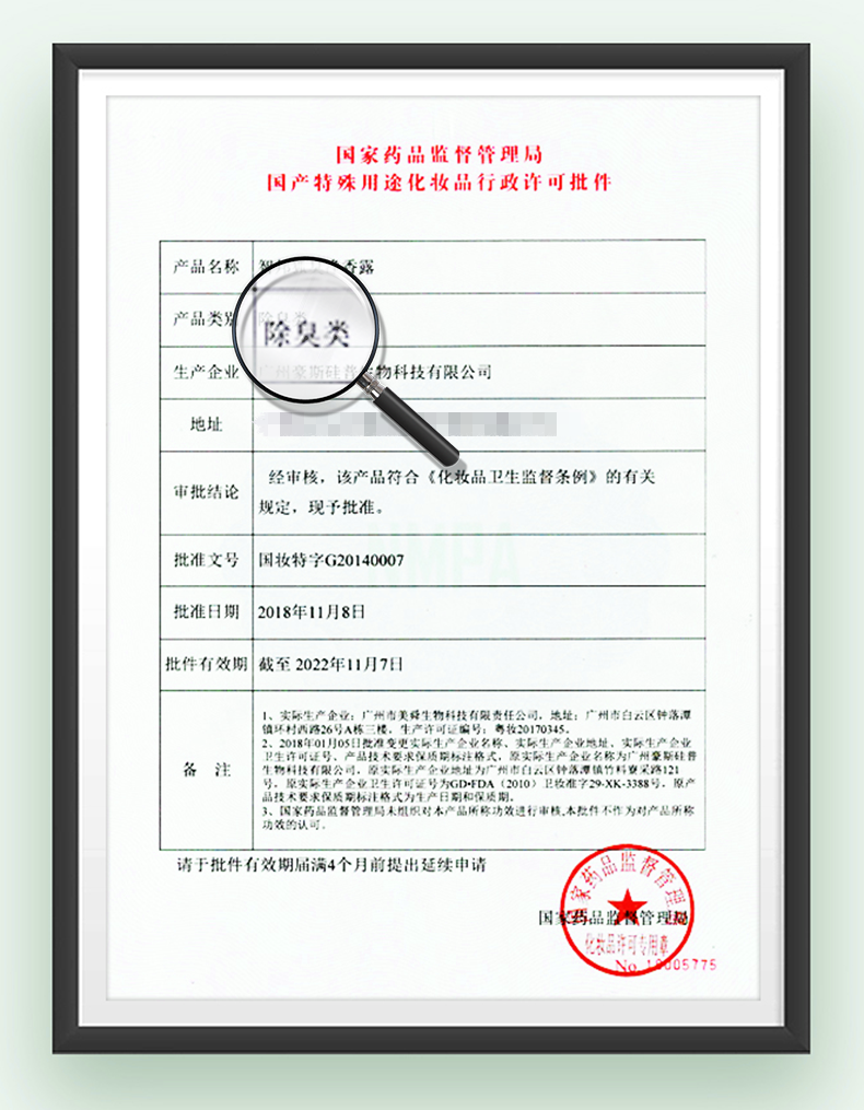 它有药监管理局颁发的去臭特证(批准文号:国妆特字G20140007)