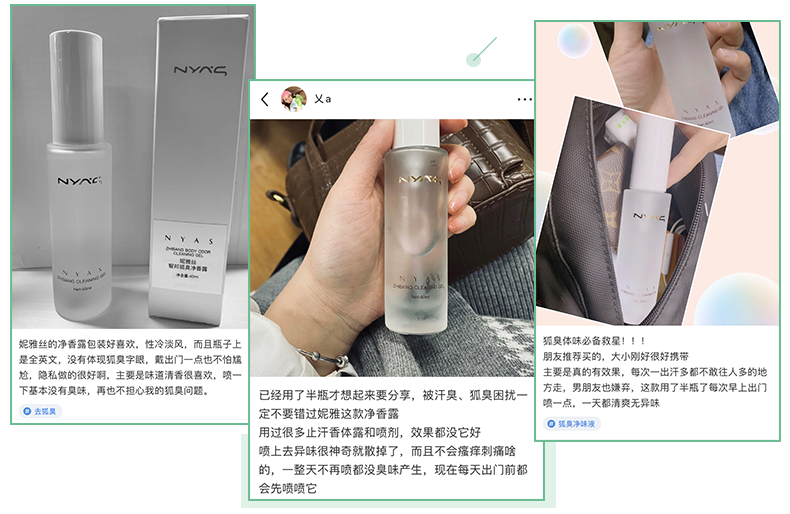 妮雅丝净香露凭借着包裹缓释去臭技术,在去臭,防味这块几乎找不到旗鼓相当的对手。