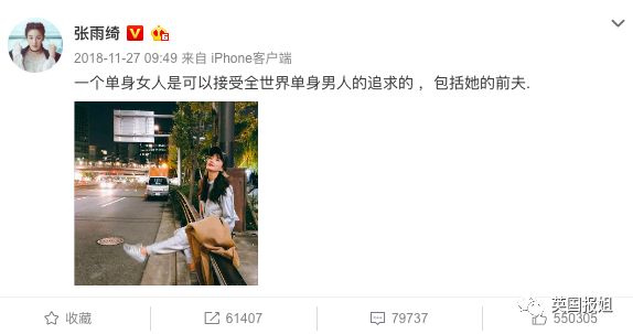 刚赞叹完,没过几天,微博上又爆出了她和前夫疑似复合的新闻。对此,一向不遮掩感情的张雨绮,又在微博上回应,说自己和谁约会都是自己的权利,包括自己的前夫。